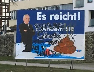Electoral success is not the only comparison being made between the AfD and the National Socialists. The AfD’s cultivation of far right supporters, the use of Nazi era rhetoric to stoke anti immigrant fears and their protestations over how German history should be remembered all contribute to a feeling that the AfD are a revival of a political movement that many had hoped to have died in 1945. I have seen no clearer example of this position than the numerous defaced AfD placards and billboards around Nürnberg, daubed with the words “Nazis Raus” (Nazis Out) in black spray paint.